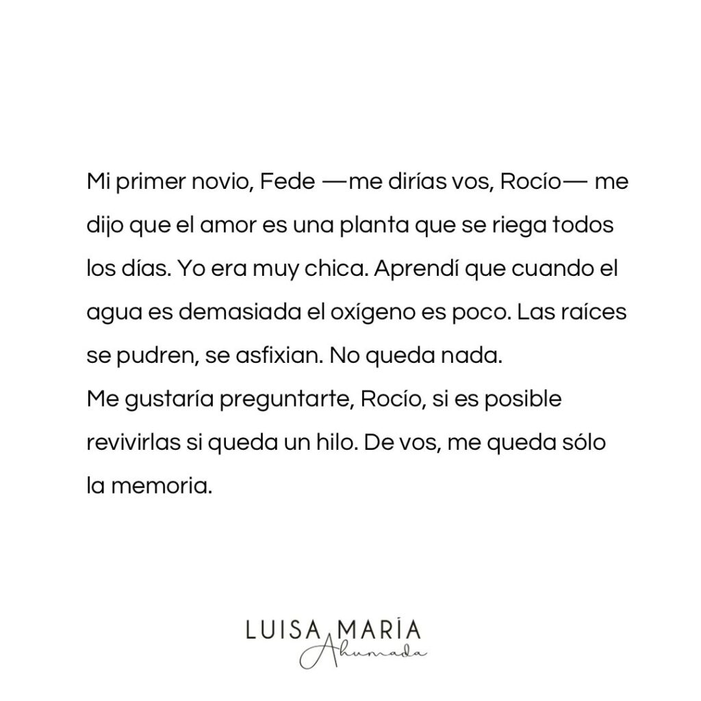 Esta idea salió de un diálogo que me inventé mientras charlaba con mi tía sobre unas plantas. La puse en la voz de Federico, el protagonista de mi novela EN NOMBRE PROPIO que se publicó en 2023. No es la primera vez que los personajes de esta novela me invitan a seguir escribiéndola.